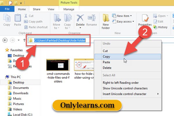 STEP 1: Sabse pehle aap us folder ko open kare jisko aap Completely Hide karna chahte hai. uska Address copy kar le (Follow Screenhoot)