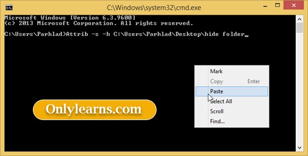 STEP 3: Command Prompt open karne ke baad apko ek command type karni hai Attrib +s +h Folder loction (Folder loction me apko folder ki loction Paste karni hai jo STEP 1 me copy ki thi. Sab kuch type karne ke baad Enter kare. itna sab karte hi apko folder Gayab ho kayega. Darne ki koi baat nahi aap us folders ko wapis bhi la sakte hai. Attrib +s +h or folder ki loctaion copy karke cmd me aaye or right click karke Paste karke or Enter Press Kare